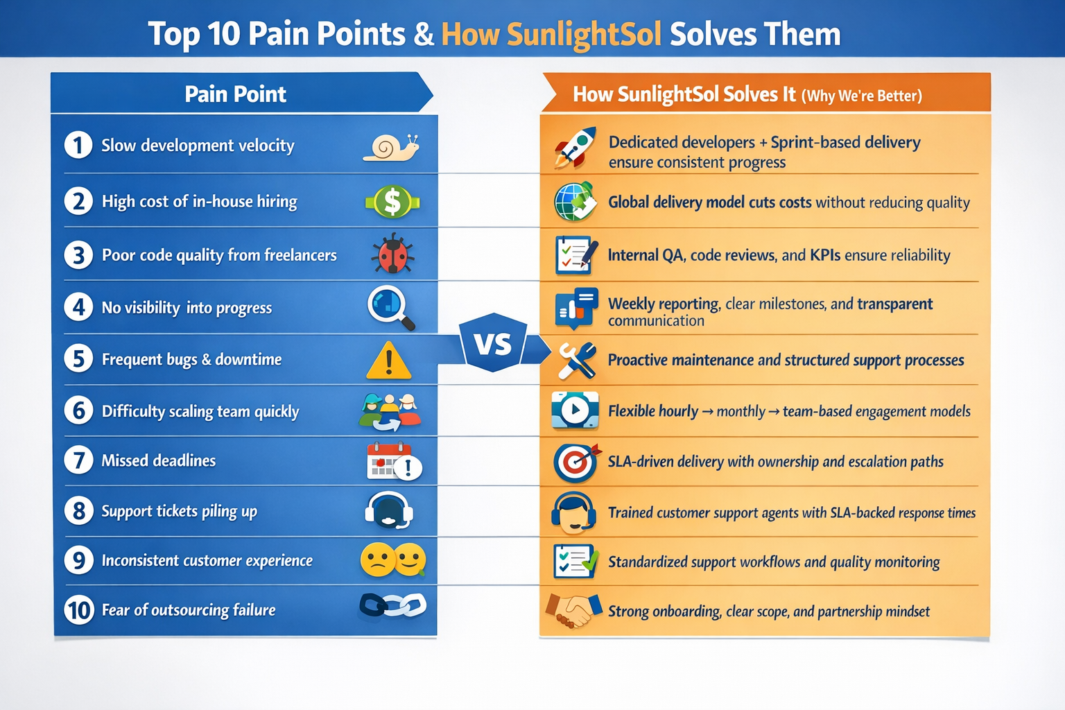 SunlightSol works behind the scenes as a trusted extension of your agency’s engineering and support teams, enabling you to scale delivery capacity without the operational burden of hiring, onboarding, or long-term payroll commitments. We integrate seamlessly into your existing workflows, tools, and processes, operating under a strict white-label model so your client relationships, branding, and ownership remain fully protected. By providing skilled developers and trained support agents on a flexible, margin-friendly engagement, we help agencies meet tight deadlines, handle workload spikes, and maintain consistent quality. Our structured delivery framework, internal QA, KPI tracking, and SLA-backed execution reduce delivery risk while giving you predictable outcomes and cost control.